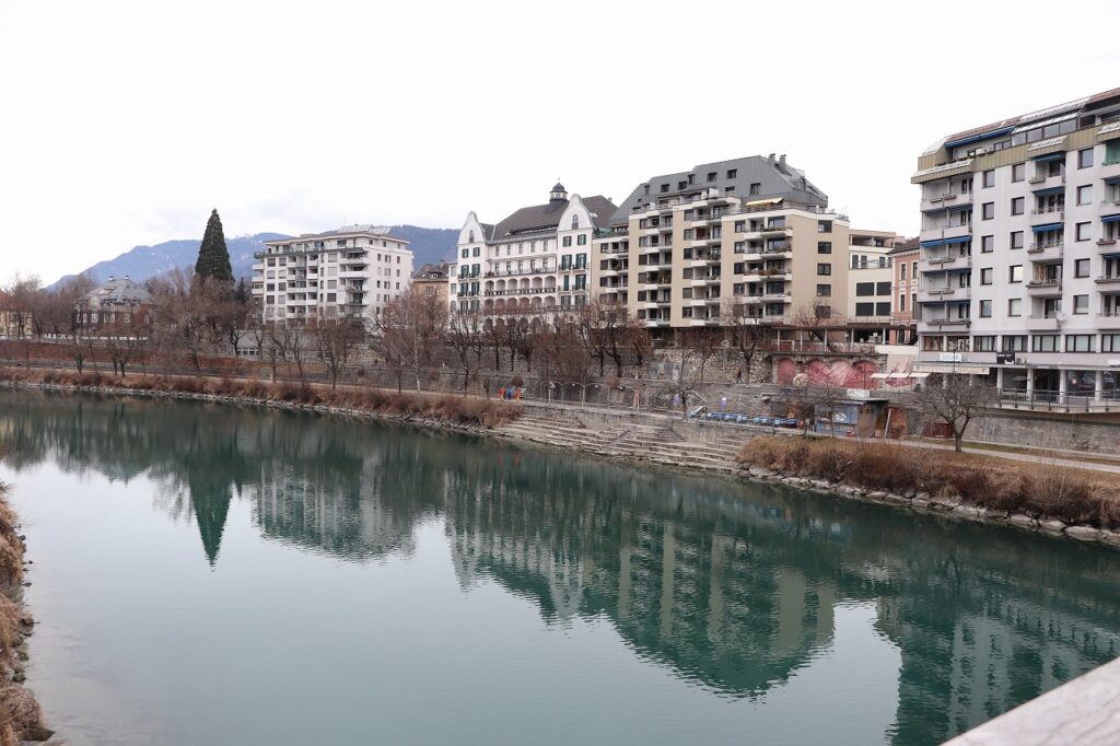 川にかかる橋から眺める景色は圧巻。川の向こう側にはアルプスの山々が広がり、晴れた日には壮大なパノラマが楽しめます。特に冬は雪化粧した山々が映え、まさに絵画のような風景に。