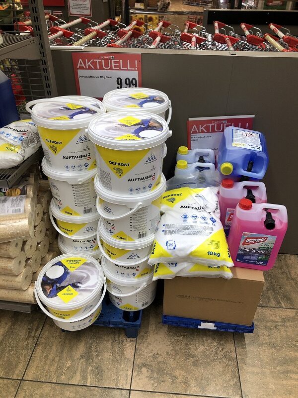 また、塩は業務用だけでなく家庭用としても広く使われており、冬になるとスーパーで雪対策用の塩が普通に販売されています。自宅前の歩道などは各自で管理する文化があるため、個人で塩を撒くケースも多いです。