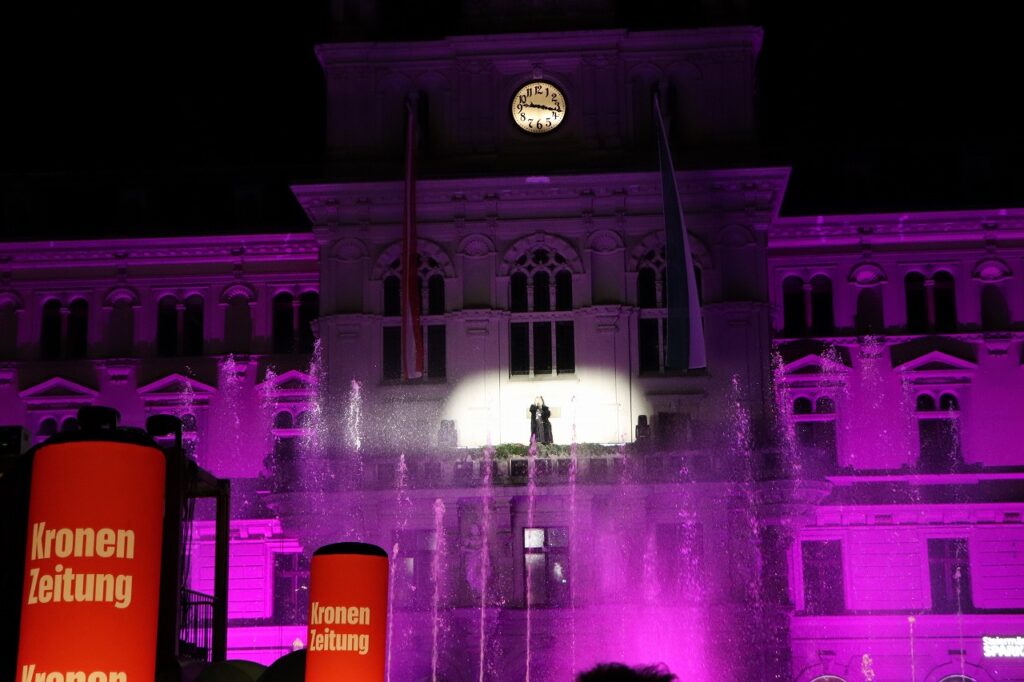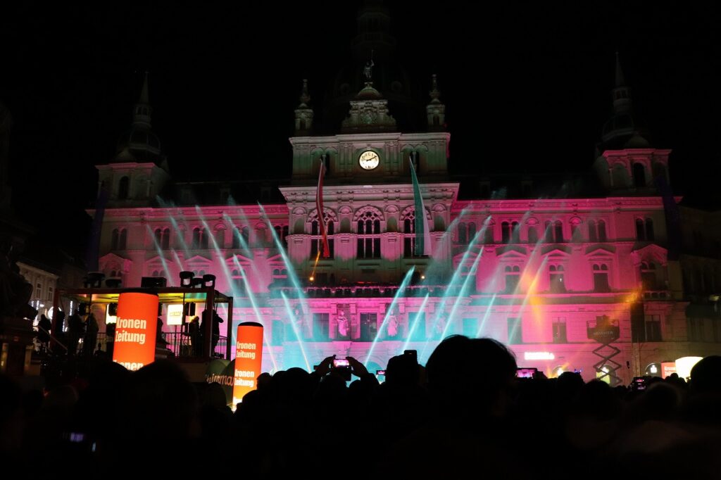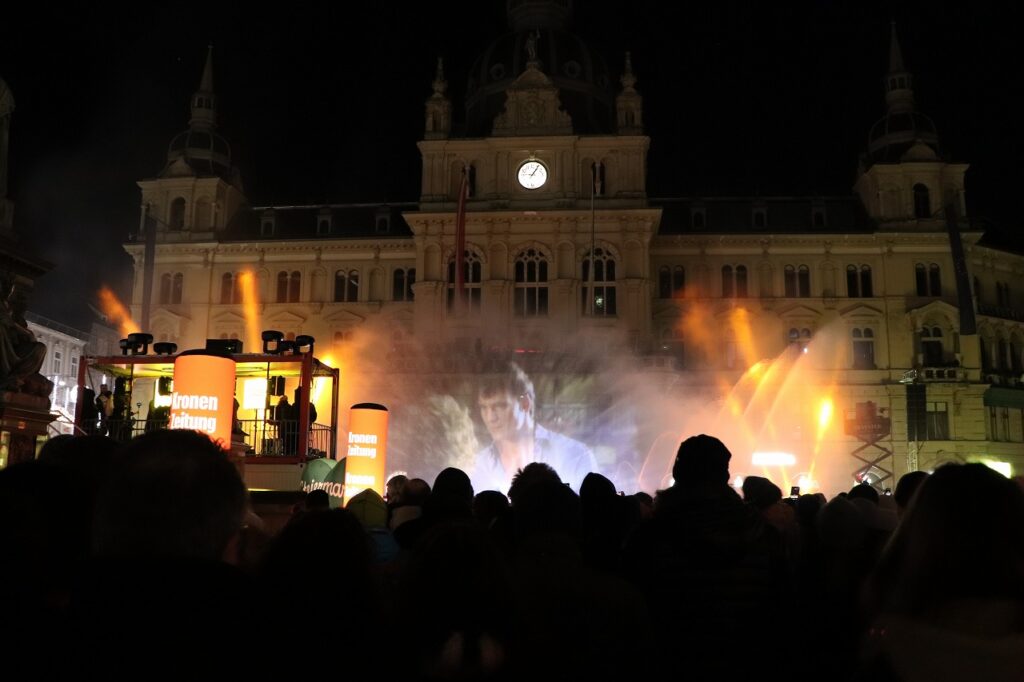 そんな静かな年末のグラーツですが、年越し当日にはきちんと公式イベントが用意されています。会場となるのは、旧市街の中心に位置するハウプトプラッツ(Hauptplatz/中央広場)。市庁舎前の広場で、グラーツの年越しイベントは行われます。