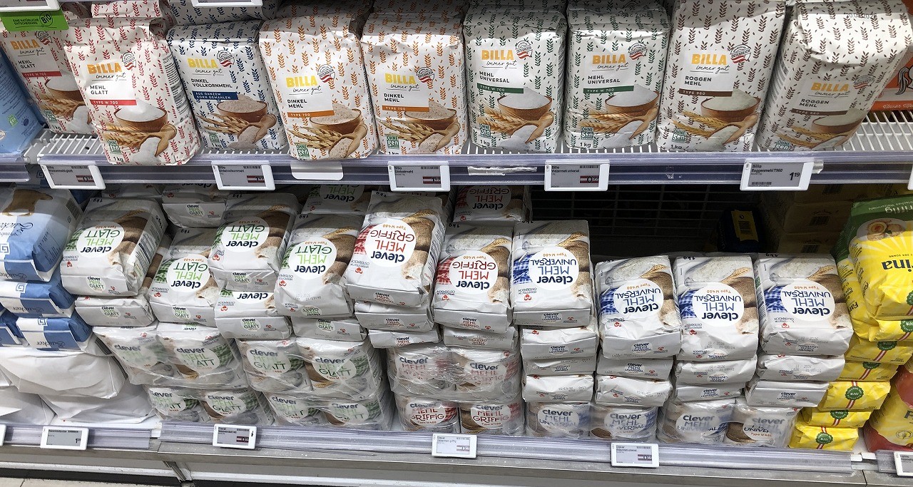 そんな背景もあり、オーストリアのスーパーに行くと、製菓材料の棚がとても充実しています。砂糖、チョコレート、ナッツ類、バニラシュガーなど様々ですが、今回はその中でも特に重要な存在である「小麦粉(Mehl)」にスポットを当ててご紹介します。