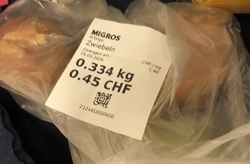 野菜の多くは量り売りです。野菜売り場の付近にある量りで重量を量って、野菜番号を入力すると、何CHFになるか印刷されたシールが出てくるので、袋などに貼ります。量らないでレジに持っていくと、量ってこいと追い返されます。