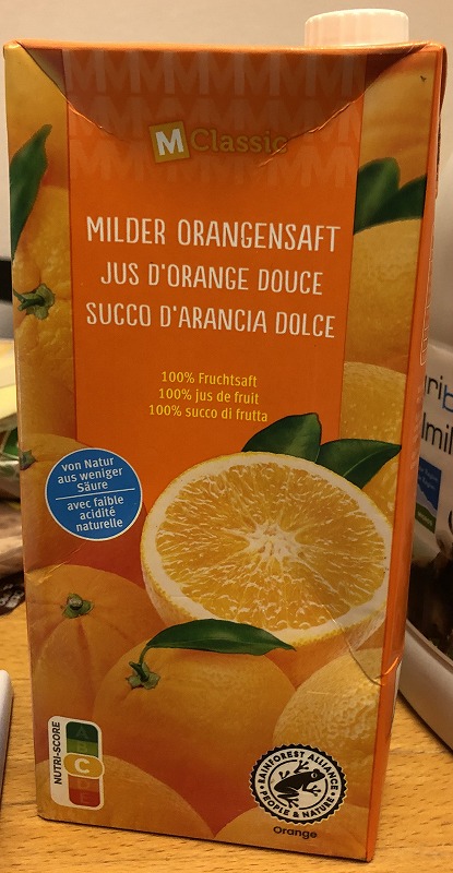 • M-Classic Orangensaft(オレンジジュース):1.8CHF / 1L
