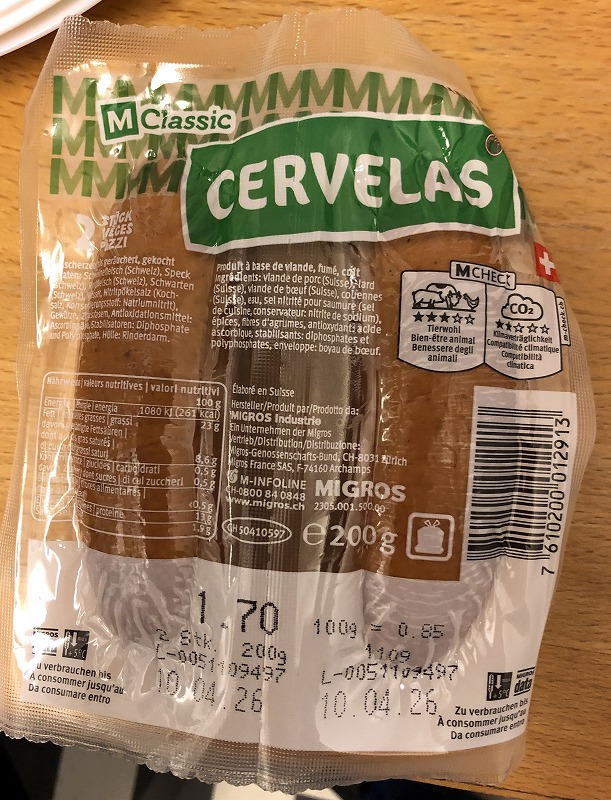 • M-Classic Cervelas(ソーセージ):1.7CHF / 2本
