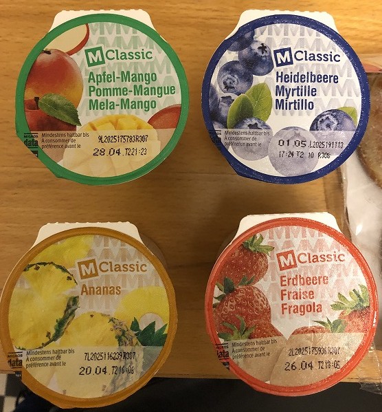 M-Classicのヨーグルトを購入しました。味はリンゴ、ブルーベリー、イチゴ、パイナップルで、それぞれ0.65CHF / 200gです。