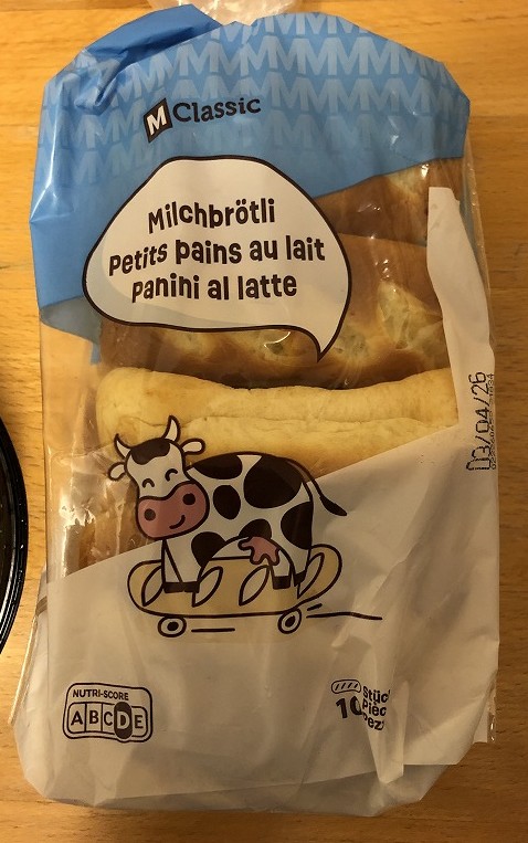 → 普通のミルクパンです。特別においしい訳でもありませんが、スナック的に使えますので、ちょっと小腹が空いた時には重宝します。なお、チョコチップ入りのものも売られていましたが、一気に 3.4CHF / 10本 に値上がりしていました。