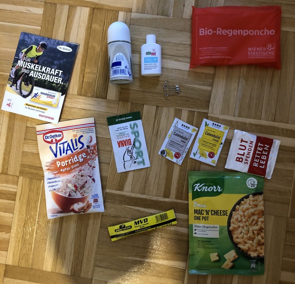 バッグの中には参加景品が入っています。レインコートやインスタント食品、日焼け止めクリーム、制汗剤、お菓子、粉末スポーツドリンクなどなど・・・割と使いやすい品物が多くていいですね。
