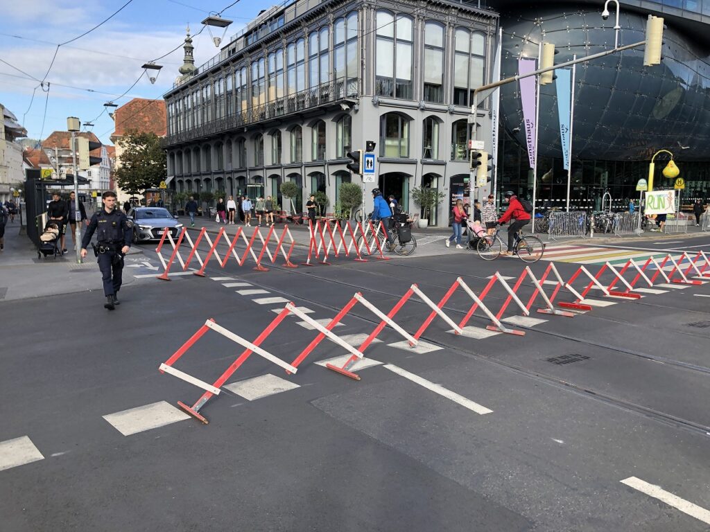なおグラーツ市街の大動脈といえるハウプトバンホーフ(電車駅)~ヤコミニプラッツの間のクンストハウスのところで写真のような封鎖がなされており、トラムは大会中は運行休止しています。大会が終わって午後になると普段通りに運行しています。