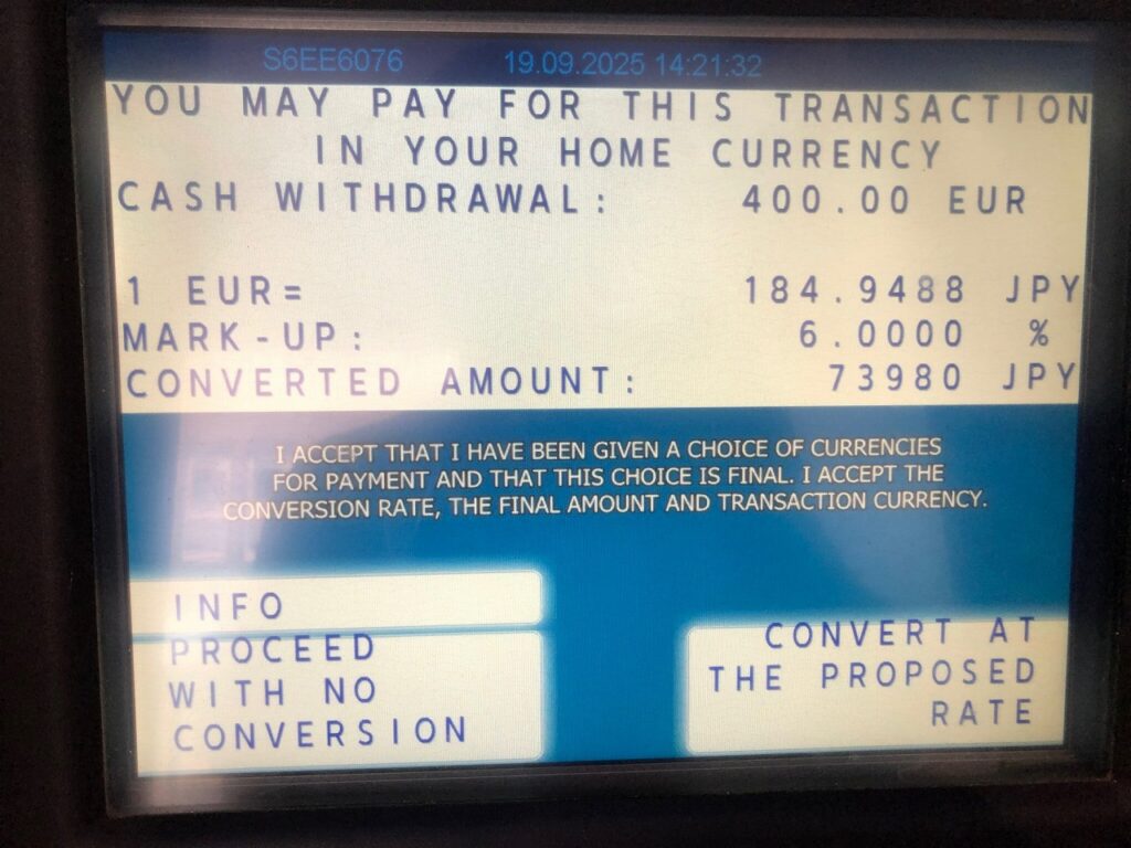 さらに注意すべきは、店舗の端末で「円決済」か「ユーロ決済」かを聞かれる場合がある点です。ここで「円」を選ぶと、端末側の為替レートが5%以上割高になることが多く、非常に損です。必ずユーロで決済するようにしましょう。