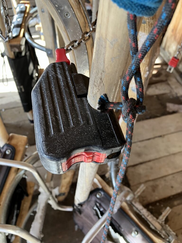 こちらはシンプルな構造。止まるときは両足を雪面につけるだけです。