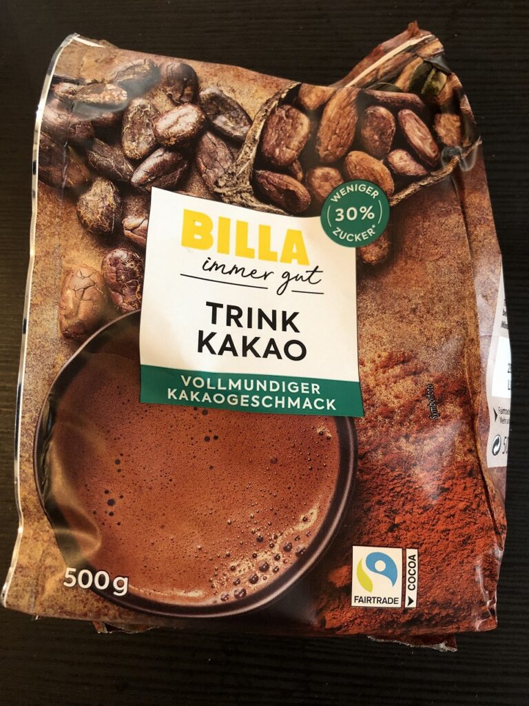 まず紹介するのは、BILLA TRINKKAKAO。砂糖が約30%、カカオ53%配合された、いわゆる調整ココアタイプです。牛乳に溶かすだけで甘いココアが簡単に作れるので、使い勝手はかなり良い部類だと思います。