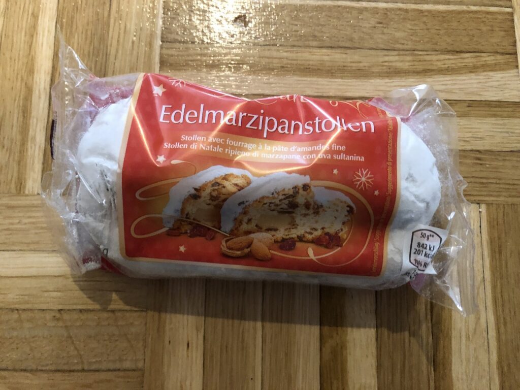 お次はドイツの定番お土産、マジパン入りストーレン。レーズンとマジパンが入った、しっとりしたお菓子です。