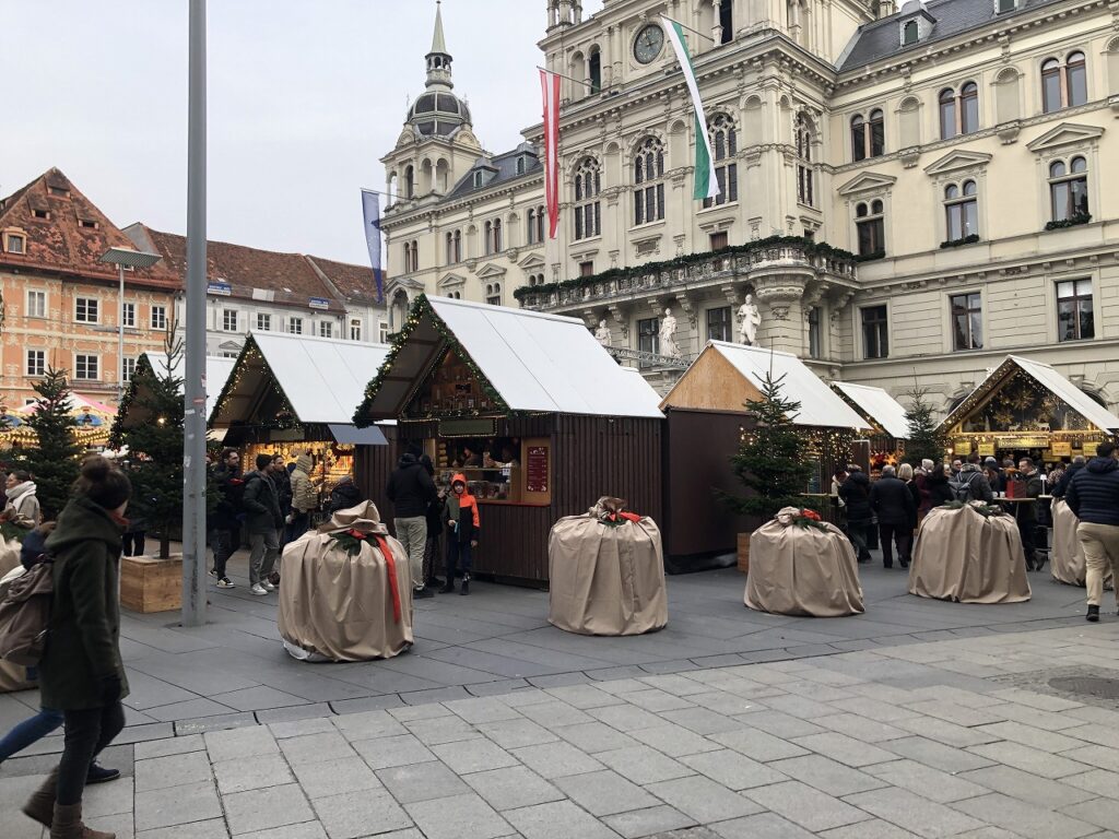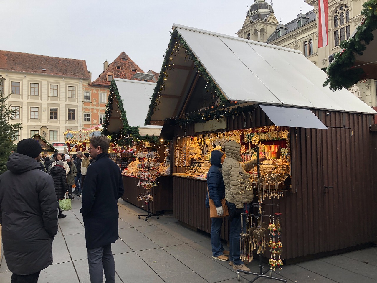 というわけで、今回はグラーツの旧市街、ハウプトプラッツ周辺に出ているクリスマスマーケットを見てきました。街全体がイルミネーションに包まれ、歩くだけでわくわくする季節。気温はもちろん寒いのですが、マーケットの熱気とホットワインの香りに誘われて、ついつい長居してしまいました。