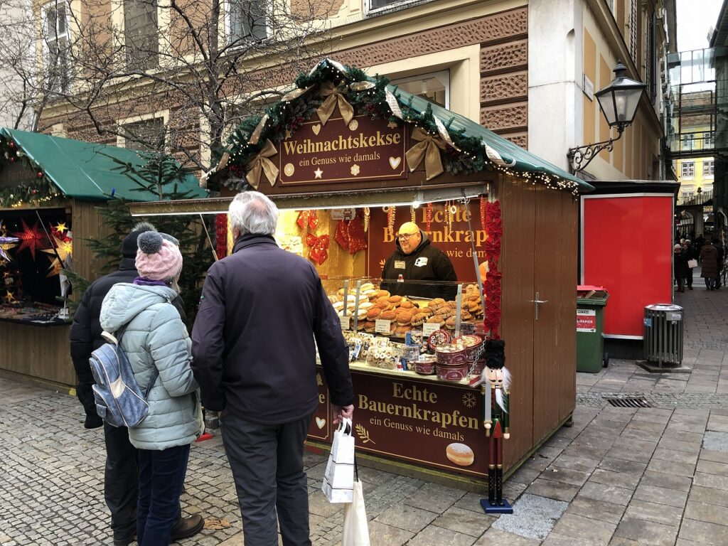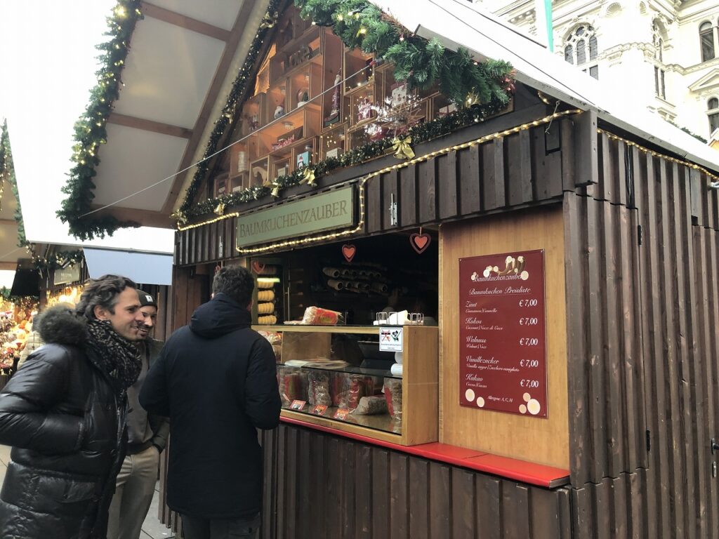 屋台では定番のホットワイン(5ユーロ)、甘く香ばしいバームクーヘン(5ユーロ)、ふわふわのドーナツ(5ユーロ)、さらにぬいぐるみ屋さんではテディベアなど雑貨も売られていました(値段は不明)。