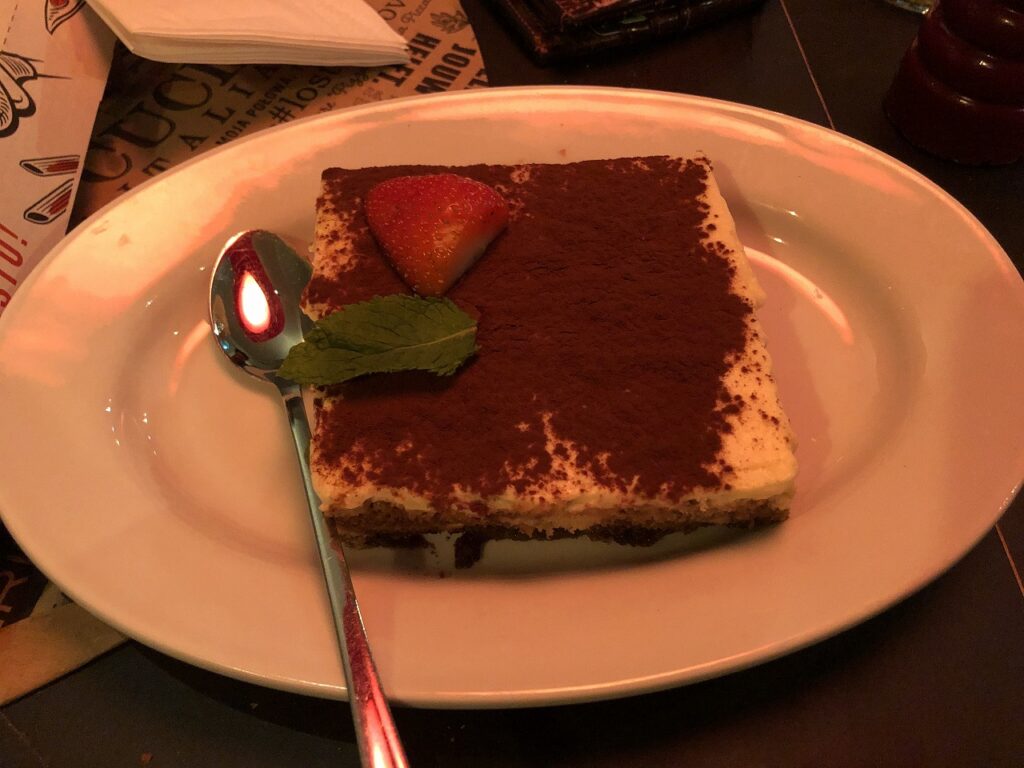 食後のデザートには定番のティラミスのほか、ジェラートもあります。ジェラートはカップに入ったシンプルなタイプでしたが、意外と美味しいという声も聞きました。私はティラミスを選びましたが、コーヒーの風味がしっかり効いていて、甘さ控えめでとてもおいしかったです。