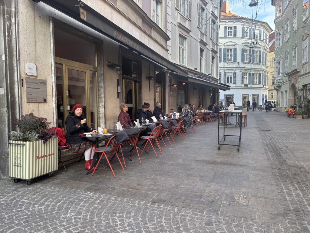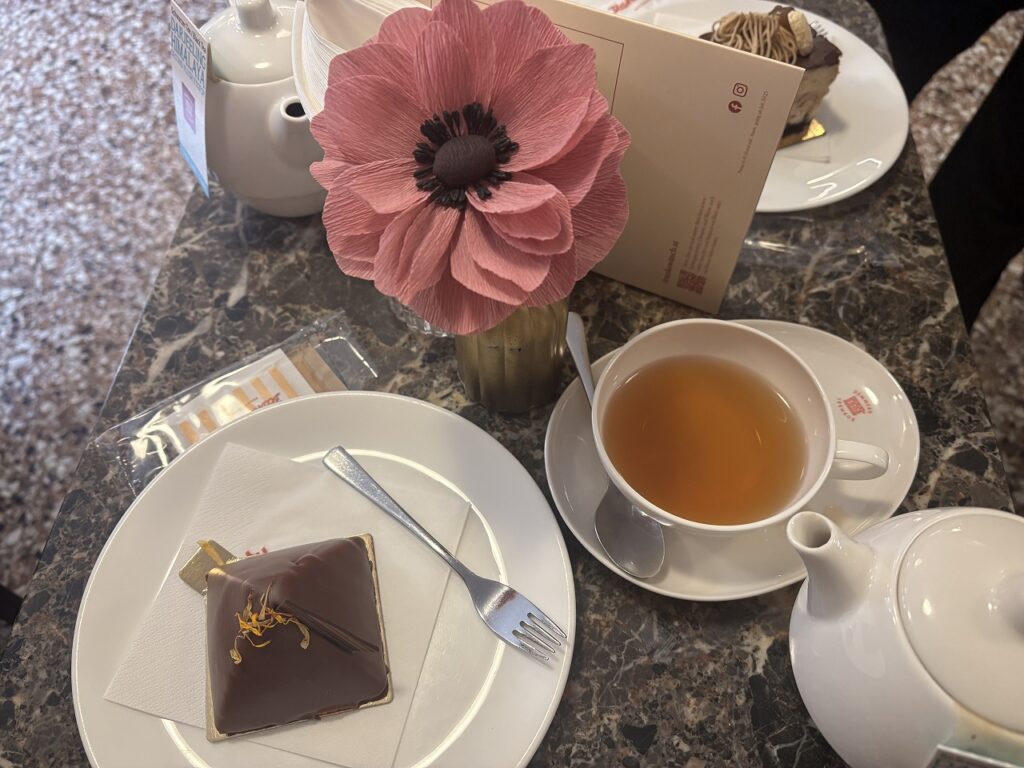 訪れた日はかなり寒く、手袋なしでは歩けないほど。ところが店先では多くの人が外のテラス席でコーヒーやケーキを楽しんでいました。寒さに強いのか、それとも外で過ごす習慣が根付いているのか…欧州の人々のこうした光景を見ると、「あぁ、旅をしているんだな」としみじみ感じてしまいます。室内の温かさも魅力的ですが、外で冷たい空気を感じながら味わう熱々のコーヒーと甘いケーキも、また格別です。