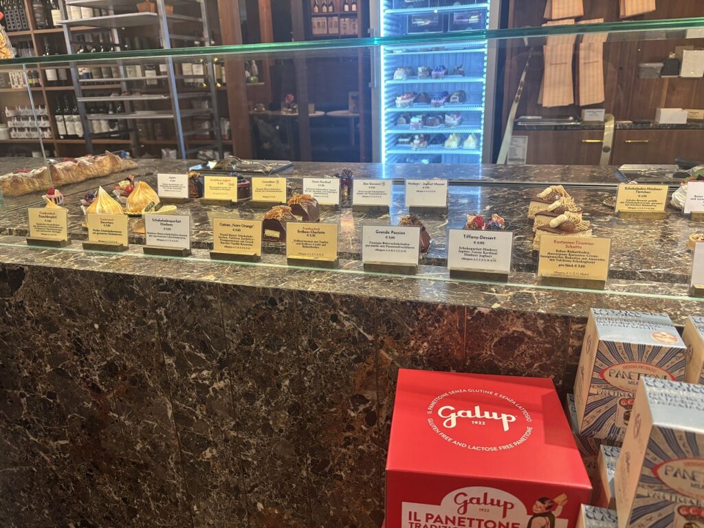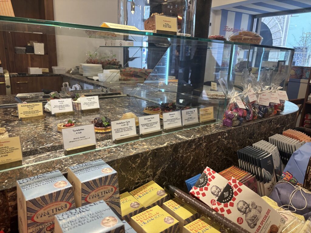 店内に入ると、ショーケースにはチョコレートを主体にしたケーキがずらり。見た目の美しさに惹かれつつも、どれにしようか悩んでしまうほど種類が豊富です。価格帯は 1個あたり約6€(1000円前後) とやや高めですが、これはオーストリアのどこのケーキ屋でも同じなので、特別高いというわけではありません。それに、クオリティを考えればむしろ納得の価格です。
