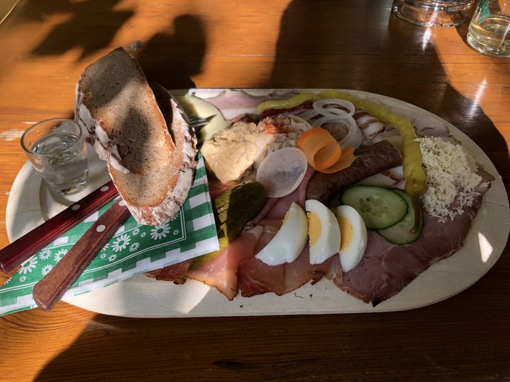注文したのは、冷製盛り合わせのプレート料理。内容は、ソーセージ、ハム、スプレッド、チーズ、地元のパンなど。「温かい料理がない」のは最初こそ驚きましたが、これはBuschenschankという制度上の制限によるものです。