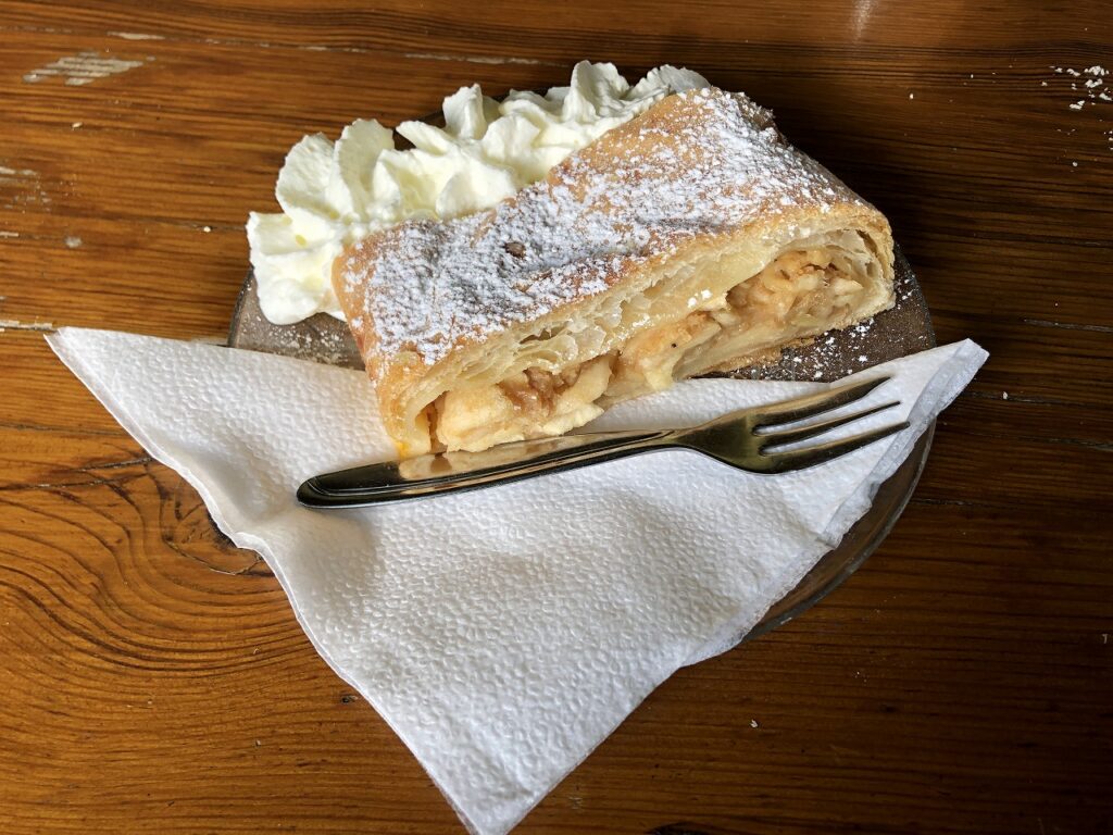 デザートには、オーストリア定番のアップルパイ(Apfelstrudel)や、チーズケーキのようなフィリングが入った焼き菓子を注文。希望すれば生クリーム(Schlagobers)**も添えてくれます。甘すぎず素朴な味で、ワインの締めにぴったり。