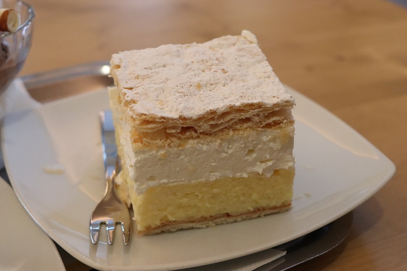 ハイキングの後は、名物のブレッドケーキがおすすめです。ブレッドケーキは生クリームとカスタードクリームをパイ生地で挟んだようなケーキです。