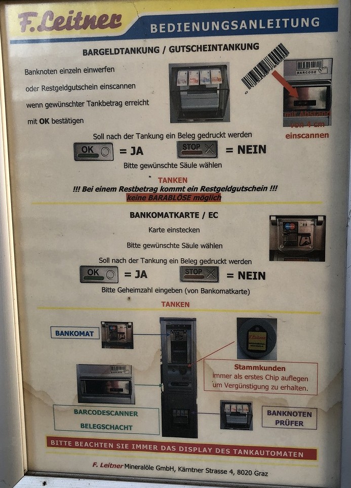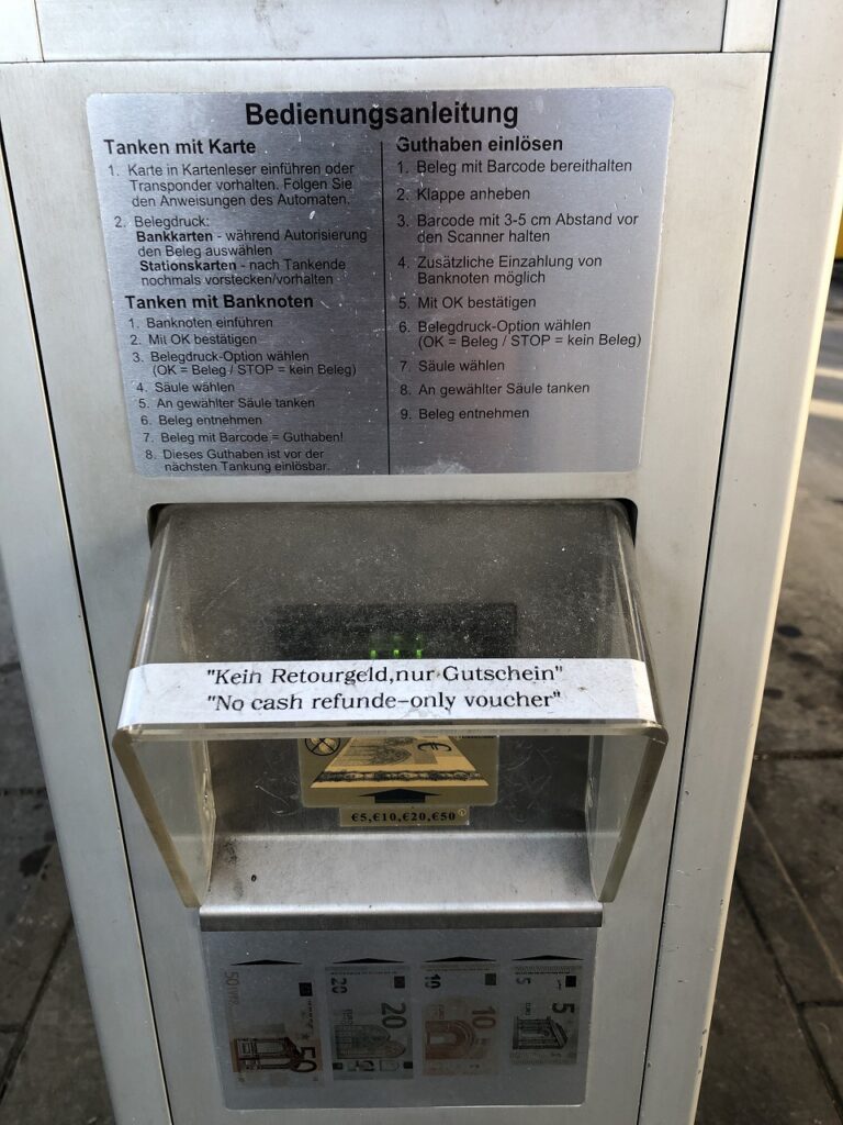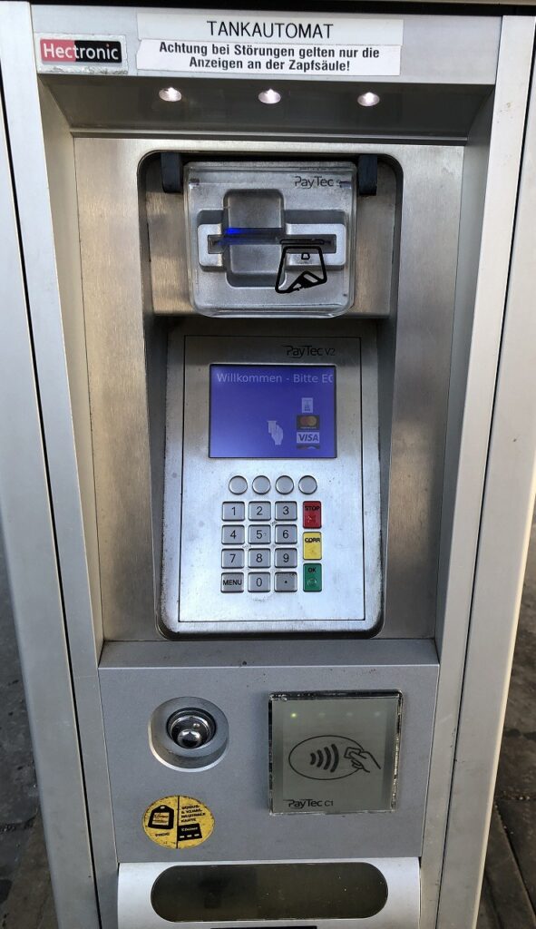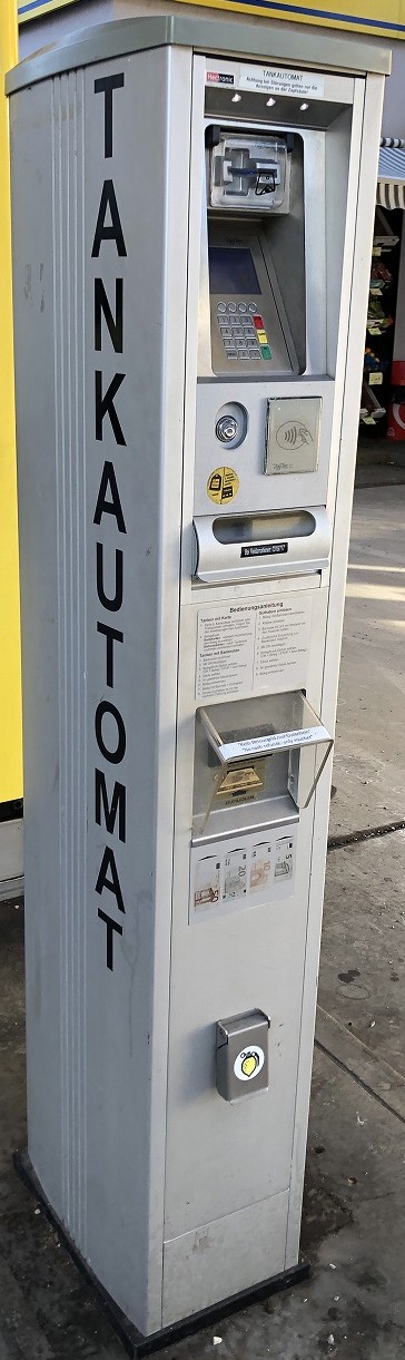 まず、車を給油したい停車スポット(ポンプの前)に停車します。位置を確認したら、次に「TANKAUTOMAT(タンクオートマット)」と呼ばれる支払い用の設備に移動します。この機械は日本でいう精算機のような役割を果たします。