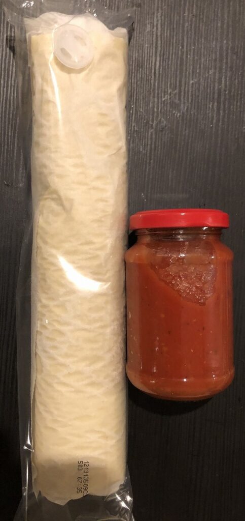 箱の中身はとてもシンプルで、丸められたピザ生地と専用のピザソースが入っているだけ。写真で見ると「これだけ?」と思うかもしれませんが、これが実はちょうどいいのです。