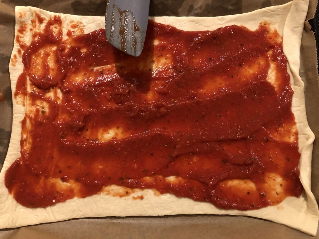 生地はすでに発酵済みの状態なので、面倒な下準備は一切不要。丸まった生地を取り出して、クッキングシートの上などで平らに伸ばします。その上に付属のピザソースを塗り広げ(※“縫って”ではなく“塗って”が正解ですね)、あとは好きな具材をのせるだけです。