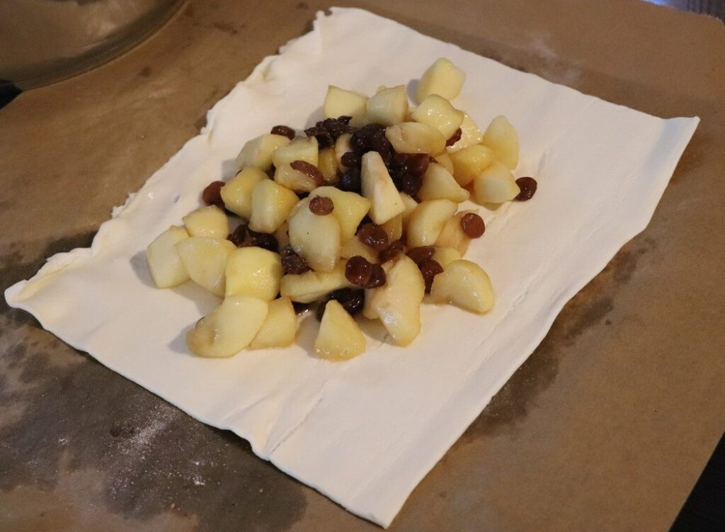 フィリングが完成したら、次は買ってきたパイ生地を広げ、その上にりんごをたっぷり乗せていきます。ストゥルーデル用の生地に比べて、パイ生地は扱いがラクで破れにくいので、形を気にせず大胆に包めるのがうれしいところ。