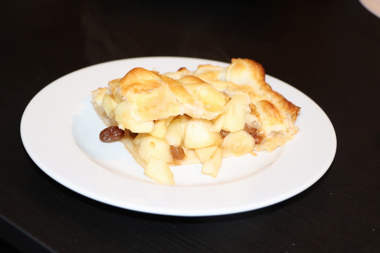 焼きあがったアップルパイは、パイ生地がしっかりサクサク、中はりんごの甘酸っぱさがとろりとしていて、安いパイ生地とは思えない満足度。フィリングの甘さもちょうどよく、ストゥルーデルを作るつもりが思わぬ形でアップルパイになったとはいえ、結果オーライでした!
